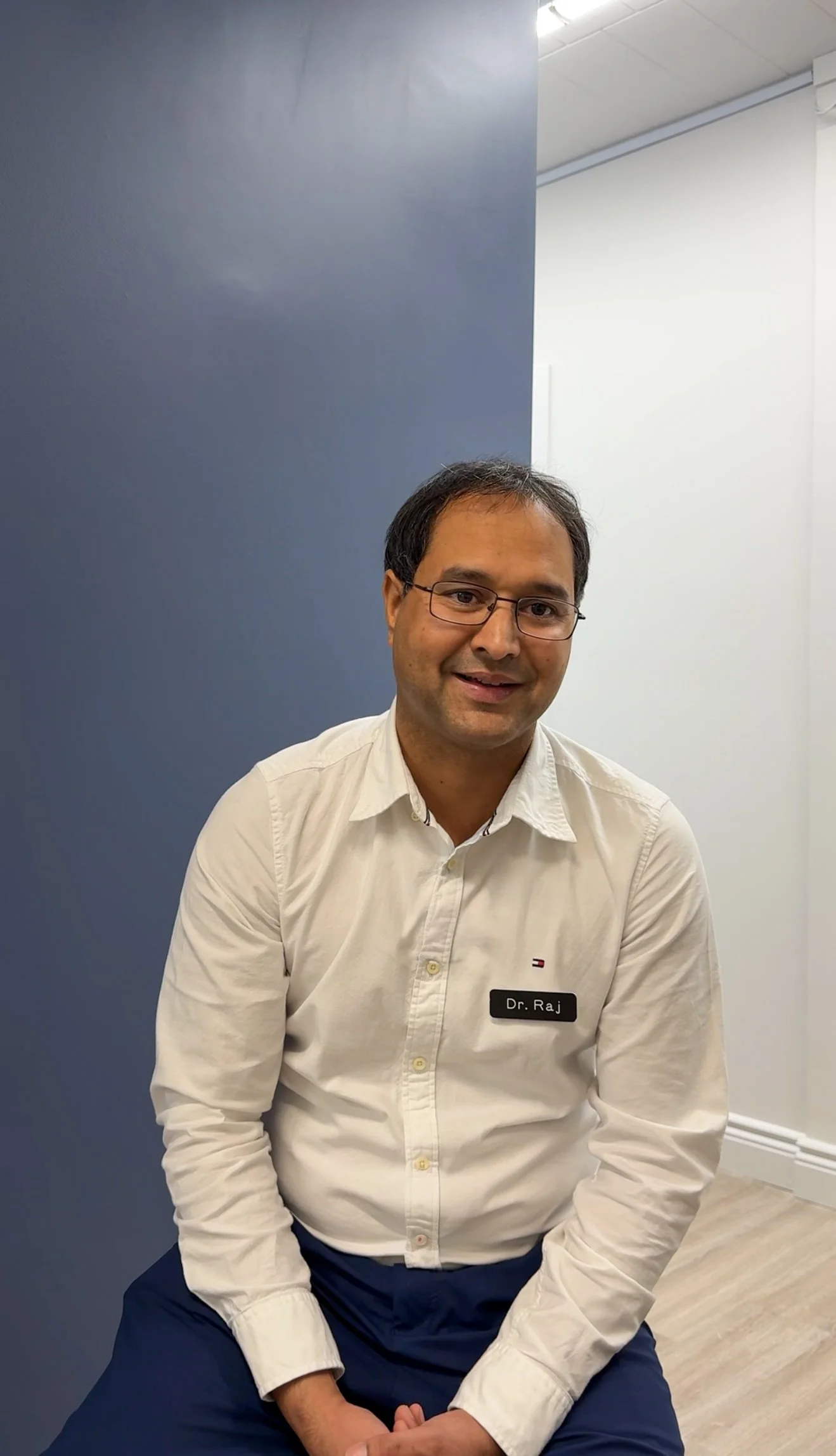 A man with glasses, wearing a white shirt with a name tag that reads 'Dr. Raj', sitting on a chair in a room with a blue and white wall.